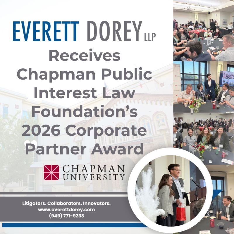 Everett Dorey is proud to be recognized at Chapman University Fowler School of Law’s 2026 Public Interest Law Foundation Alumni Scholarship Reception with the Corporate Partner Award for the firm’s continued pro bono work throughout the community.